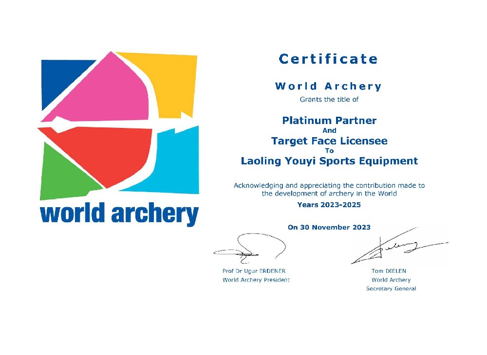目前,主要生產(chǎn)和銷售射箭比賽及訓(xùn)練專用器材,包括:箭靶、靶紙、靶架、號(hào)碼牌、風(fēng)向旗、計(jì)時(shí)記分器等場(chǎng)地器材設(shè)備;反曲弓、復(fù)合弓、傳統(tǒng)弓、瞄準(zhǔn)器、防震桿等弓箭裝備;箭壺、護(hù)胸、護(hù)臂、護(hù)指等各類箱包護(hù)具。公司所生產(chǎn)的射箭器材已通過國(guó)際射箭聯(lián)合會(huì)及中國(guó)射箭協(xié)會(huì)CAA認(rèn)證。